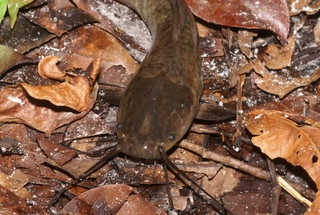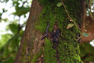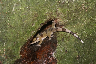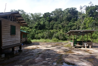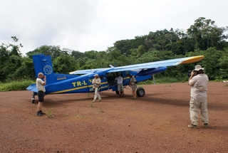 Im Camp der Wildlife Society Conservation (WCS) Nach einer Zwischenstation in der Loango Lodge fliegen wir mit unserem seltsamen Piloten weiter nach Ivindo. Tief im Herzen Schwarzafrikas gelegen liegt dieser Nationalpark. Nach 2-stündigem Flug über zusammenhängenden Flachlandregenwald landen wir auf einer Rodung im Wald. Von hier aus müssen wir noch 2 Stunden über übelste Pisten mit dem Geländewagen fahren bevor nach weiteren 2 Stunden Gewaltmarsch durch den Regenwald das Camp erreichen. Dieser Marsch mit vollem Gepäck ging bis an die Grenzen der Belastbarkeit. Das Camp ist kein Touristen-Camp, sondern ist Forschungsstation der Wildlife Society Conservation (WCS) und liegt auf einem Granitplateau mitten im Urwald. Am nächsten Tag bricht die Expedition nach Langoue Bay auf. Diese offene Stelle im Regenwald ist ein Platz von unbeschreiblicher Schönheit. Hier im Herzen von Gabun können wir an einer Flusslandschaft mit mineralhaltigem Boden Waldelefanten, Flachland-Gorillas, Sitatunga-Antilopen, rote Pinselohrschweine und Waldbüffel beobachten. Natürlich liegt unser Hauptaugenmerk auf den Amphibien und Reptilien und wir finden tatsächlich einen kleinen unbeschriebenen Taggecko der Gattung Lygodactylus. Auch interessante Killifische der Gattung Diapteron finde ich in kleinen Bächen.