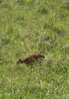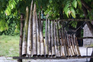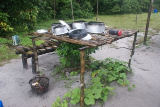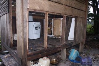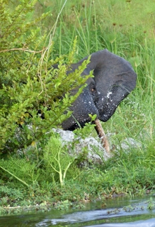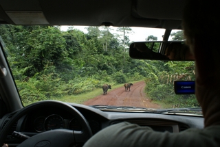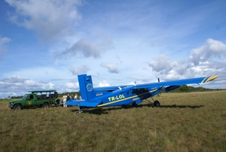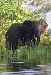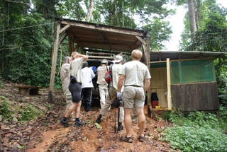 Das nächste Camp heißt Tassi und liegt mitten in der Savanne, die von Urwaldinseln unterbrochen wird. Von unserer Aufenthaltsplattform haben wir einen fantastischen Blick. 200 Meter vor unserer Plattform wandert eine Gruppe Flachlandgorillas gemächlich über die Savanne. Ein mächtiger Silberrücken führt sie an. Waldbüffel, Pinselohrschweine, Sitatunga-Antilopen und Waldelefanten kommen und gehen. In einer wassergefüllten Trittspur eines Waldelefanten fange ich 6 Kap Lopez (Aphyosemion australe). Bei Einbruch der Dunkelheit erscheint plötzlich wie aus dem Nichts ein Elefant und kommt bis auf 10 Meter an das Camp heran. Wir freuen uns über diesen Besuch und denken uns nichts dabei. In der zweiten Nacht kommt er wieder und zerstört Teile unsere Camp-Küche und unsere Aufenthaltsplattform. Die große Kühlkiste nimmt er mit den Stosszähnen und schleudert sie 10 Meter weit. Gottseidank geht sie nicht auf, wäre schade um die kalten Getränke gewesen. In der darauffolgenden Nacht ist dann der Spaß vorbei. Er nimmt eines unserer Zelte aufs Korn und reißt uns mitten in der Nacht aus dem Schlaf. Es muss schon ein seltsames Gefühl sein, wenn plötzlich ein riesiger Schatten vor dem Zelt erscheint und sich anschließend zwei Stosszähne durch die Zeltplane bohren. Zum Glück verfehlen die Stosszähne die auf ihren Betten liegenden Team-Mitglieder. Durch einen durchdringen Schrei eines Zeltinsassen geht der Elefant 5 Meter auf Abstand. Anschließend versuchen unsere Jungs den Elefanten mit dem Jeep in den Wald zu drängen. Er kommt allerdings nach kurzer Zeit immer wieder. Die restliche Nacht verbringen wir im Freien. Am Morgen beschließen wir das Camp zu verlassen, bevor Schlimmeres passiert. Die Dorfgemeinschaft in der Nähe des Camps muss nun entscheiden, ob der Elefant getötet werden muss. Die letzte Entscheidung trifft der Häuptling. In der Regel wird der Kadaver dann an die Pygmäen verteilt, da die ansässige Bevölkerung kein Elefantenfleisch verzehrt.