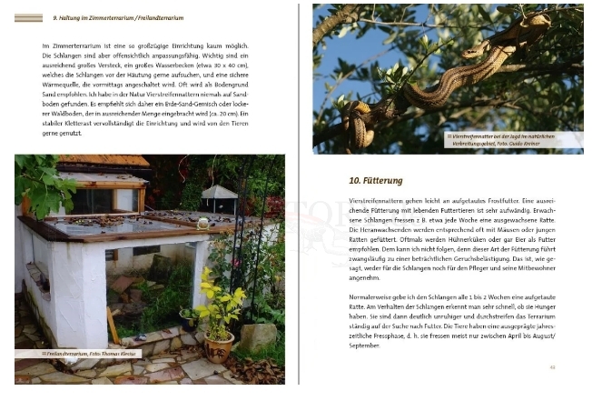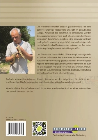 Auch die verwandten Arten der Vierstreifennatter werden aufgeführt: Die östliche Vierstreifennatter (Elaphe sauromates) und die Äskulapnatter (Zamenis longissimus).Wunderschöne Tieraufnahmen und Naturfotos machen das Buch zu einer informativen und unterhaltsamen Lektüre.