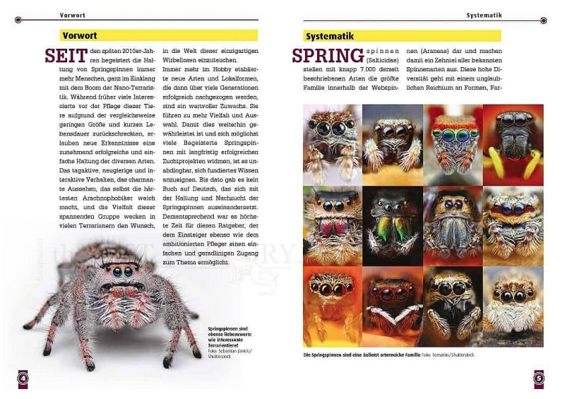 Wer kann sich dem Charme von Springspinnen schon entziehen? Das Kindchenschema ihres ausdrucksstarken Gesichts lässt einfach niemanden kalt! Dazu kommen ein höchst spannend zu beobachten-des Verhalten, leuchtende Farben und sehr einfach zu erfüllende Ansprüche an eine artgerechte Haltung. Kein Wunder, dass die sympathischen Springer voll im Trend liegen! Dieser Band schildert ausführlich, worauf es bei Erwerb und Pflege zu achten gilt, stellt die am häufigsten gehaltenen Arten und Farbformen vor und gibt reichlich Tipps zur erfolgreichen Pflege – da klappt es sicher auch mit der Nachzucht! Im Buch vorgestellte Arten - Phidippus regius (Königsspringspinne) - Phidippus otiosus - Phidippus bidentatus - Phidippus audax - Hyllus diardi - Hyllus giganteus - Hyllus walkenaeri - Plexippus paykulli
