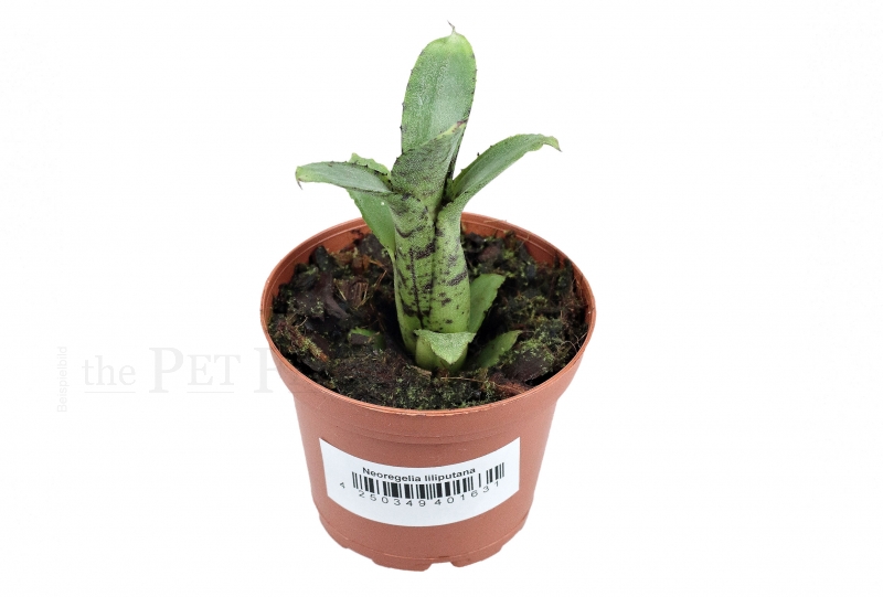 Bei Neoregelia lilliputiana ‘Akeso’ handelt es sich um einen Hybrid aus den Naturformen Neoregelia ampullacea var. tigrina und Neoregelia lilliputiana. Sie ist mit einer Höhe von nur 8 cm der Zwerg unter den von uns angebotenen Bromelien und eine echte Rarität für das Regenwaldterrarium. Neoregelia ‘Akeso’ ist eine koloniebildende Art, die in einer Gruppe von mehreren Pflanzen zusammen auf einen Epiphytenast gepflanzt besonders natürlich wirkt. Sie mag einen feuchten Standort mit Moosunterlage, der nach der Beregnung aber auch abtrocknen kann. Aufgrund ihrer zierlichen Erscheinung eignet sie sich bereits für Terrarien ab 30 cm Kantenlänge. Je mehr Licht sie bekommt, umso kompakter ist die Wuchsform und umso intensiver die Zeichnung.
